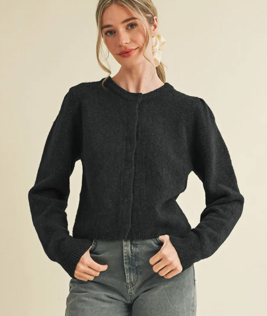 Long Puff Sleeve Sweater Cardigan-Black