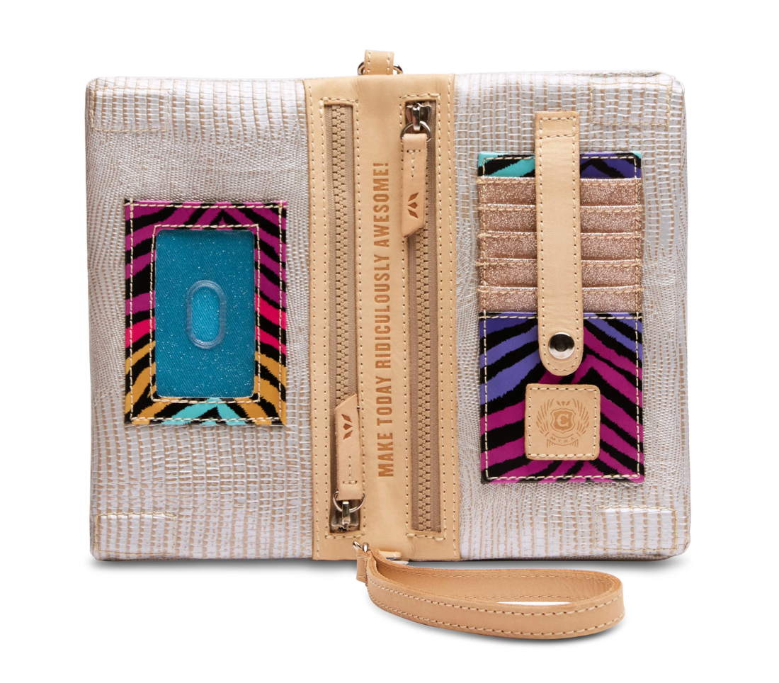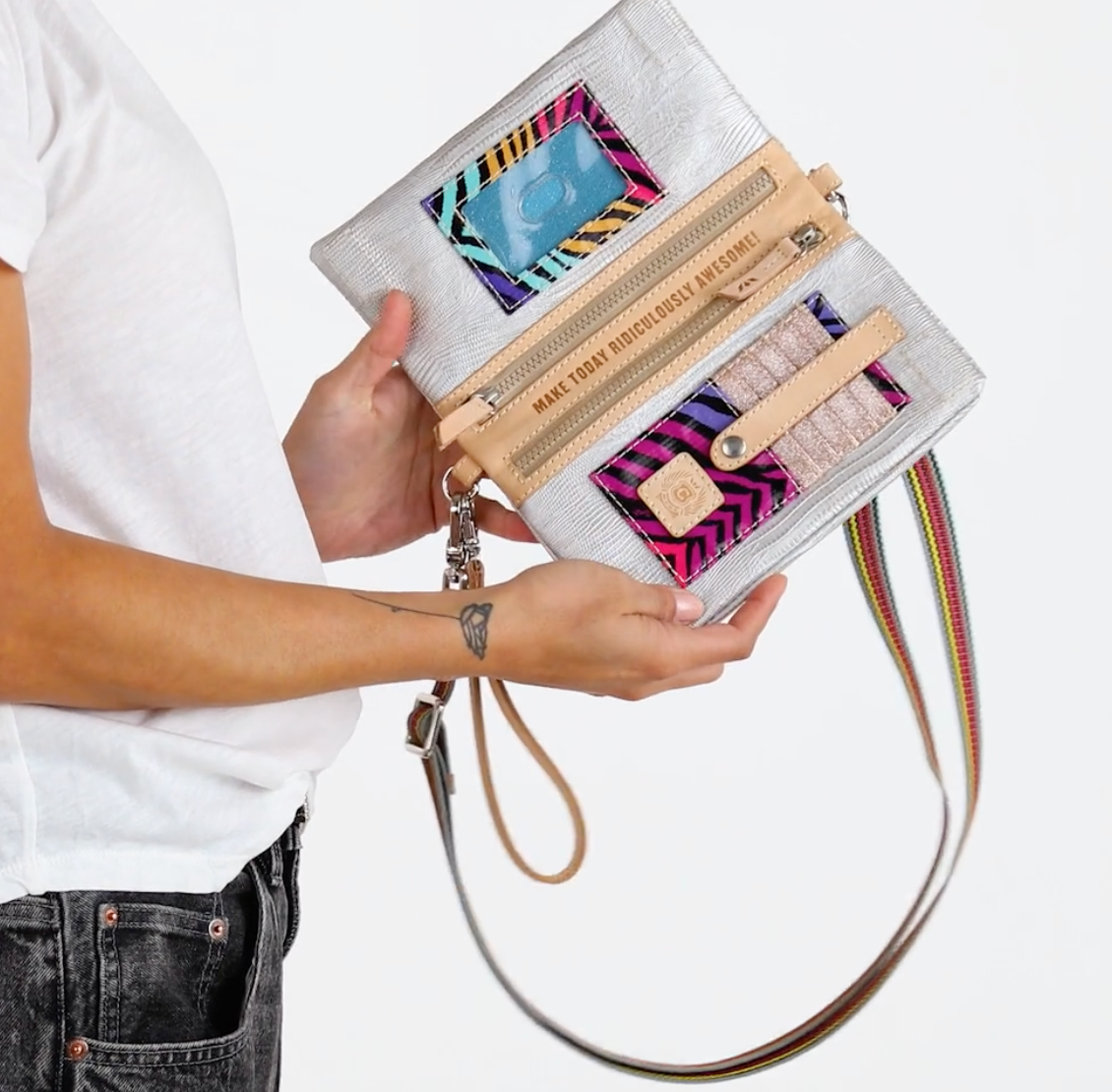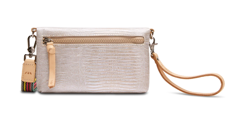 - Included detachable wristlet strap and adjustable woven crossbody strap