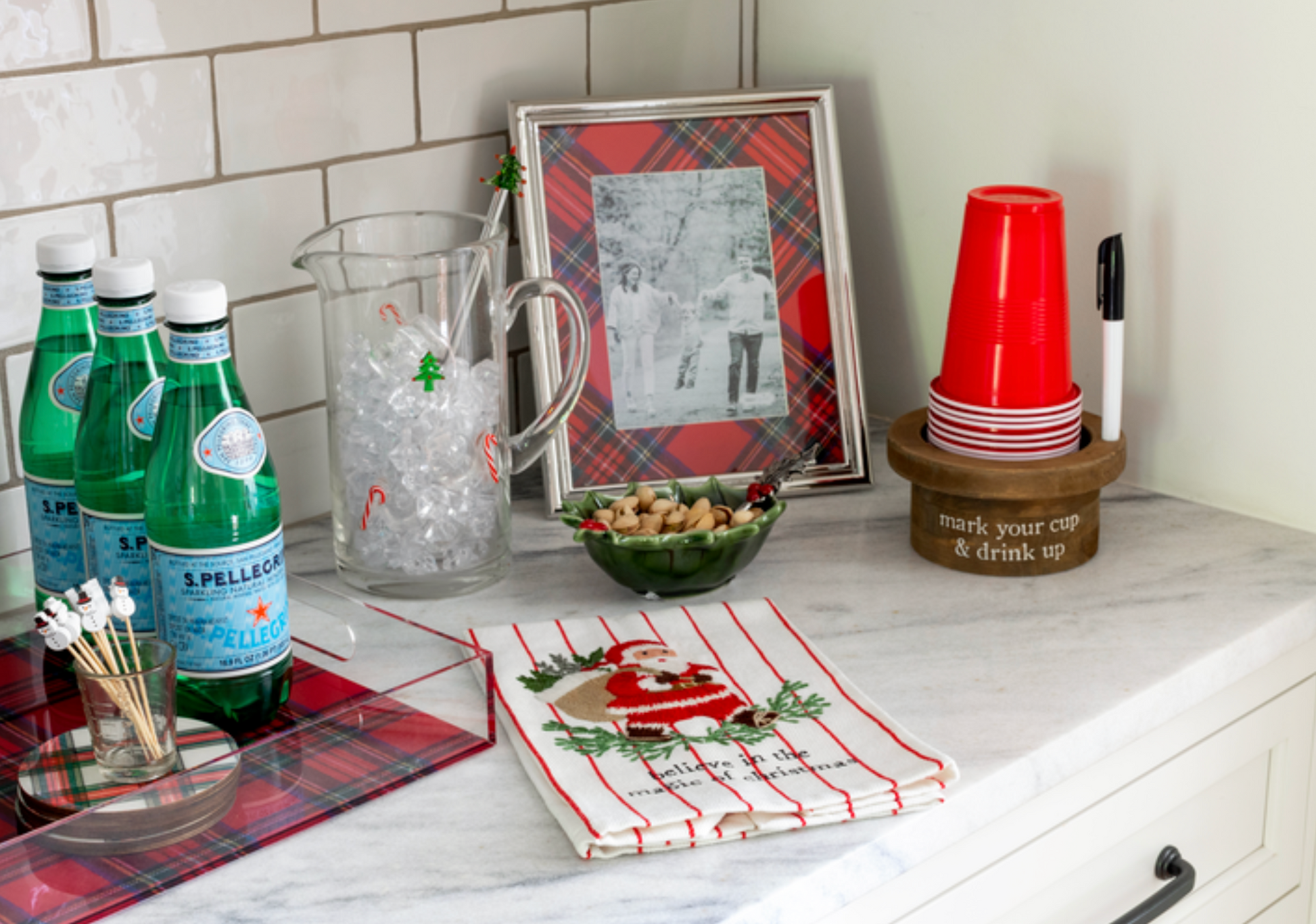 The Disposable Cup & Marker Set is a convenient and fun 3-piece set that includes ten plastic party cups and a permanent marker. The cups are neatly organized in a wooden base with a designated spot to hold the marker. Each cup has a capacity of 18 ounces and the base measures 3" x 5 1/2" in diameter. Perfect for parties and gatherings, this set allows guests to personalize their cups with the marker, ensuring that they can easily identify their drink. After the event, simply dispose of the cups for easy cleanup. Enjoy a personalized and hassle-free drinking experience with this Disposable Cup & Marker Set.