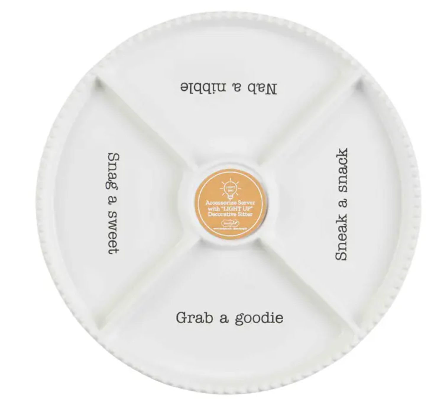 Our Divided Serving Tray is the perfect companion for your snacking needs. Crafted from high-quality ceramic, this tray features four convenient sections, each adorned with a unique sentiment. With phrases like "Nab a nibble," "Sneak a snack," "Grab a goodie," and "Snag a sweet," you'll always find the perfect spot for your favorite treats. Made from durable dolomite, this tray measures 12 1/4" in diameter and is dishwasher safe for easy cleanup. For an added touch of charm, consider pairing it with our Mud Pie Decorative Sitter in the center. Elevate your snacking experience with our versatile and stylish Divided Serving Tray.