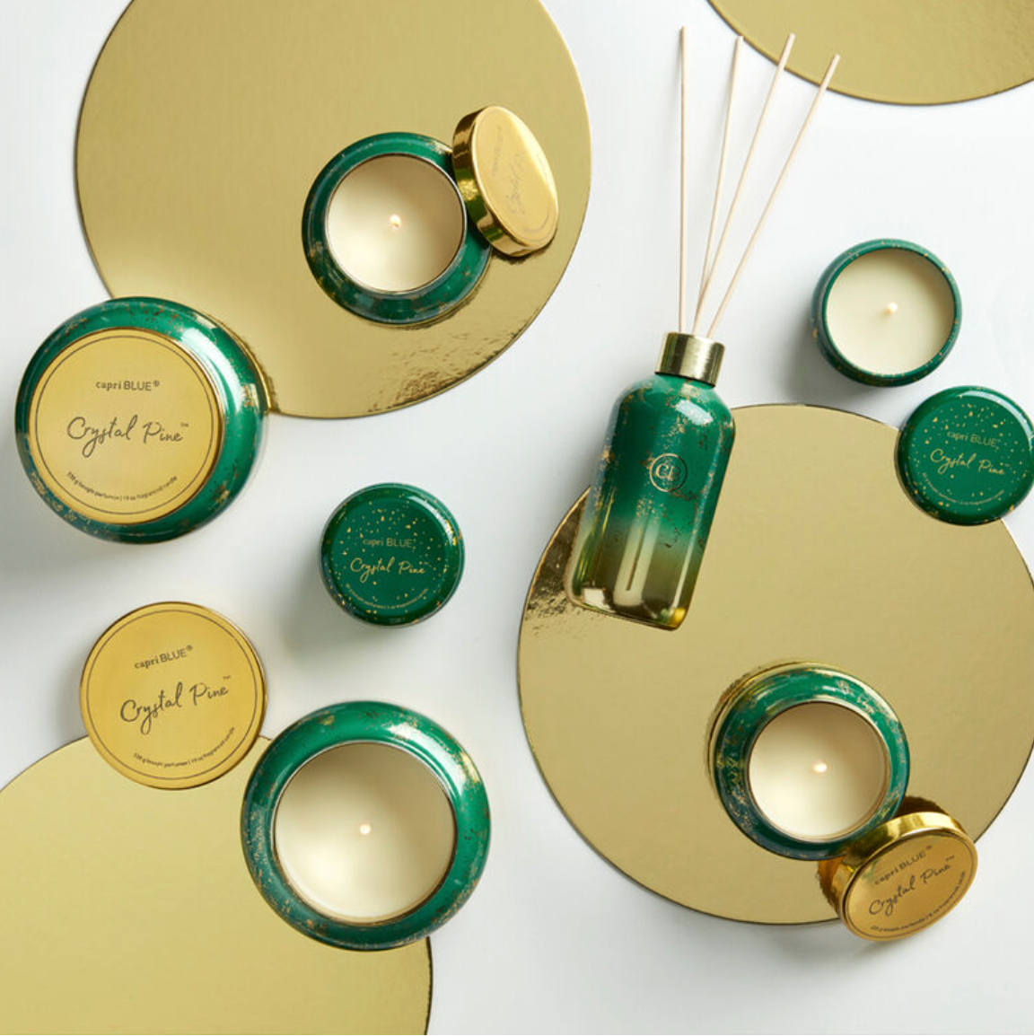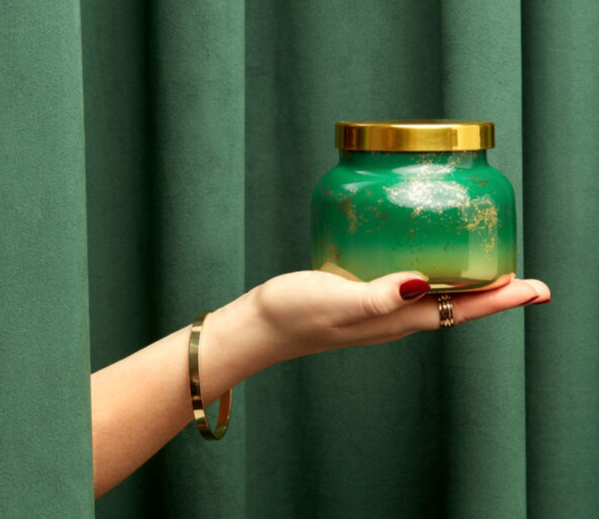 Our new Crystal Pine Glimmer Inverted Jar is the perfect addition to your holiday decor! Filled with notes of frosted fir, snowy woods, pine and sage, this emerald green jar with a gold finish is just what your home needs this holiday season.