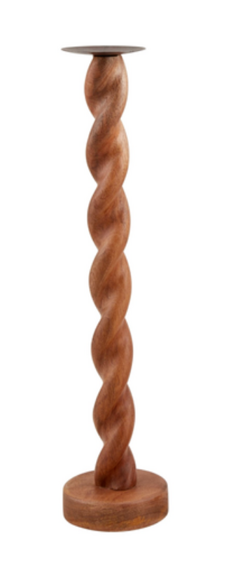 The Large Twisted Wood Candlestick is a stunning decorative piece crafted from high-quality mango wood, known for its durability and unique grain patterns. This candlestick features an intricate twisted design that adds an elegant and artistic touch to any room. It is equipped with a sturdy metal coupe candle plate, ensuring stability and safety for your candles. Measuring 20 inches in height and 3 inches in diameter, this candlestick is perfect for creating a warm and inviting atmosphere in your home. Its natural wood finish complements a variety of interior styles, from rustic to contemporary, making it a versatile addition to your decor.