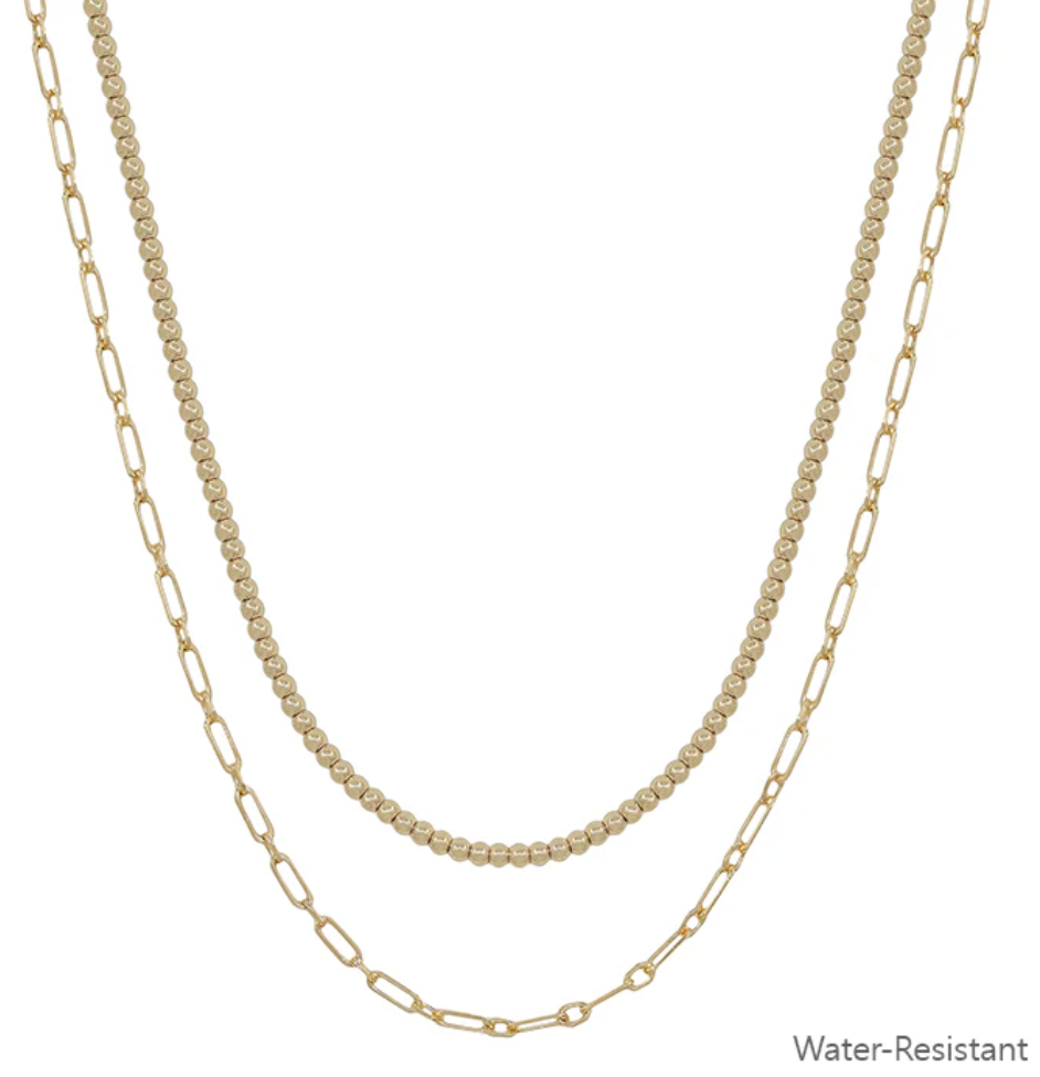 Water Resistant double layered gold beaded and chain 16"-18". With Gold bead earrings
