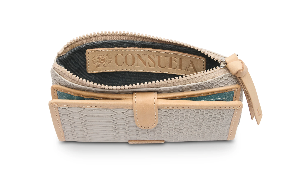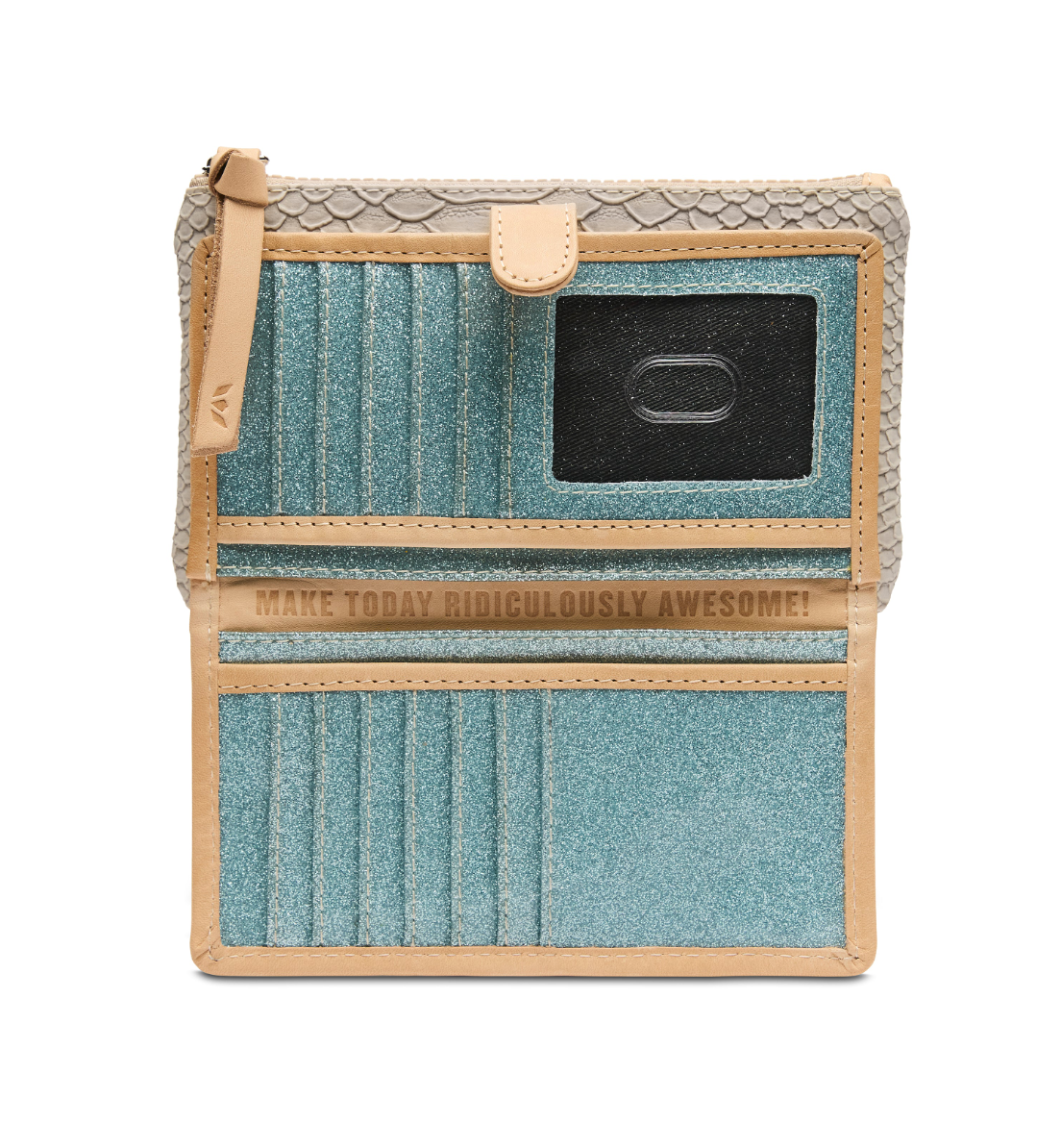 Our Slim Wallet carries cards and cash without weighing you down. Open the snap closure to reveal an ID window pocket, 12 card slots, and 4 slide pocket compartments in this versatile and colorful wallet.