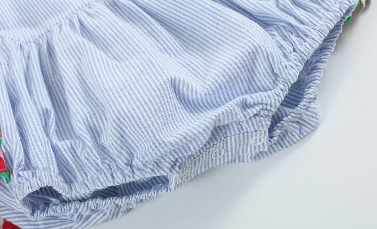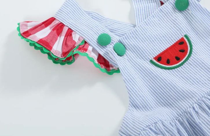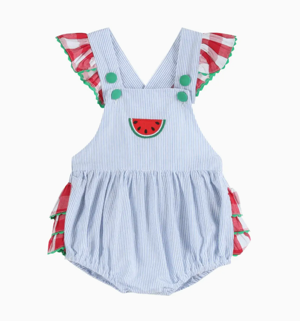 Let your little one make a statement with this beautiful light blue seersucker and gingham romper. Featuring feminine flutter sleeves, an enchanting watermelon applique, and a delightful ruffle bottom, this onesie will have your little cutie dressed to impress. Crafted for comfort and style, this one-of-a-kind romper is sure to be their favorite for any event.